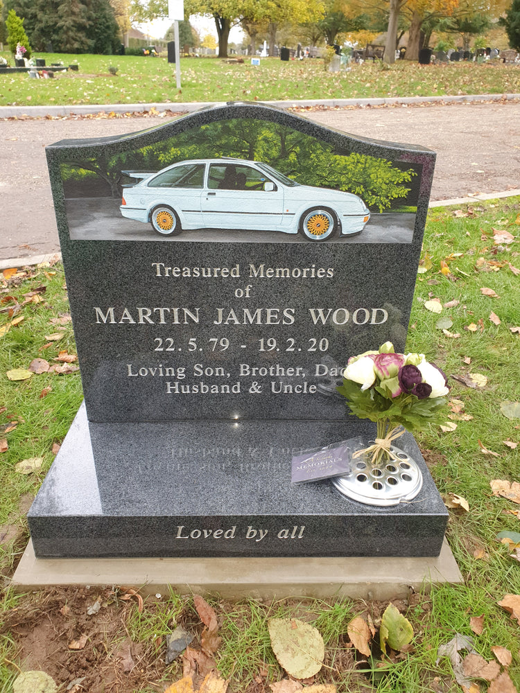 Tablet style headstone with free standing square vase.