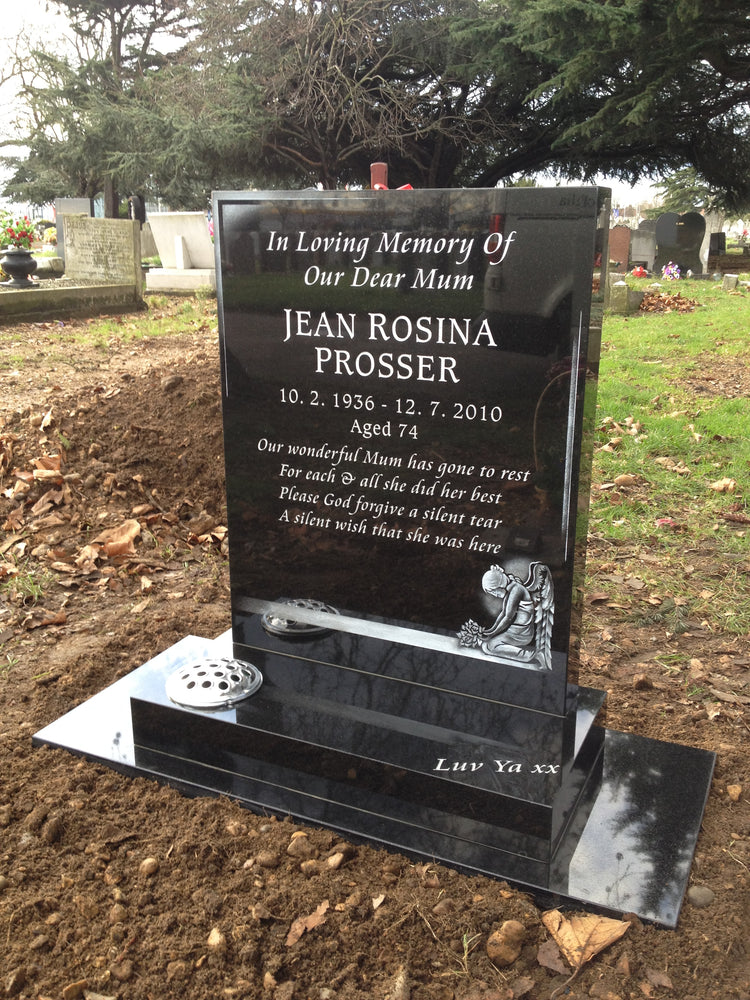 Tablet style headstone with free standing square vase.